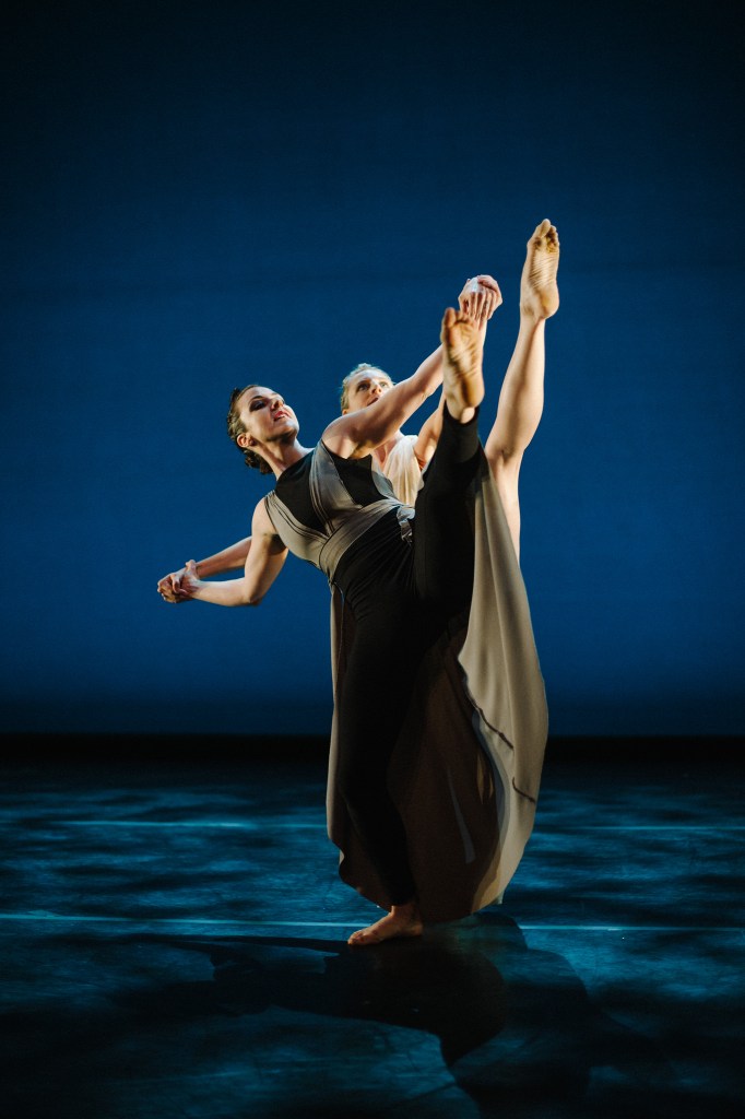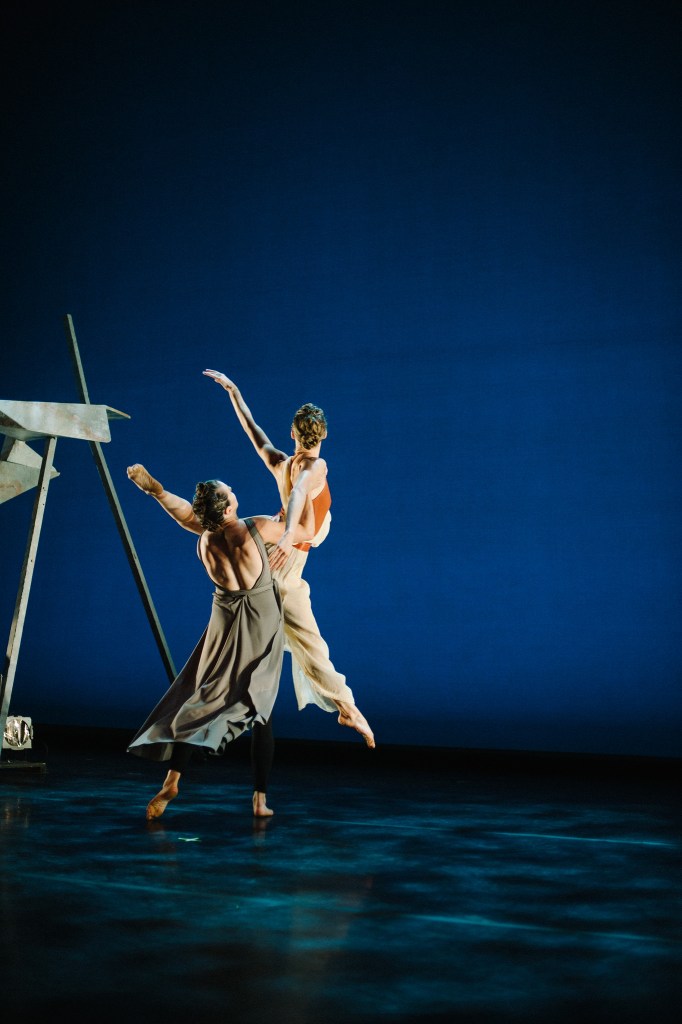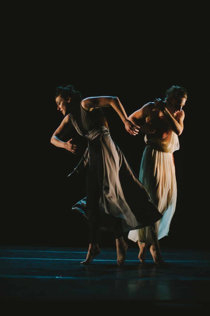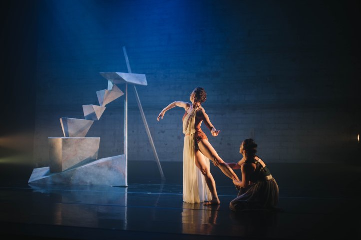 Like The Chronicles of Narnia and The Screwtape Letters, Till We Have Faces is one of Lewis’ many Christian allegories. It uses the myth of (https://www.slideshare.net/AlemarAllecer/cupid-and-psyche-summary) Cupid and Psyche to explain “why the gods do not speak to us openly.” The original myth and Lewis’ retelling contain many a complicated twist, but Elu has wisely focused their choreography on the relationship between the two main characters in Till We Have Faces, the sisters Psyche and Orual, danced by choreographers and Elu co-founders Mikaela Brown and Mackenzie Valley. The sisters, dear reader, have conflicting attitudes toward the god of the Grey Mountain. Psyche is willing to be sacrificed and happily married to a god she cannot see; skeptical Orual sees her sister as duped and deluded. Add to their contentious duet the mountain, a beautiful, functional abstract staircase designed and built by sculptor Mark Sugiuchi, and you have a firm, tripartite basis for dance drama.