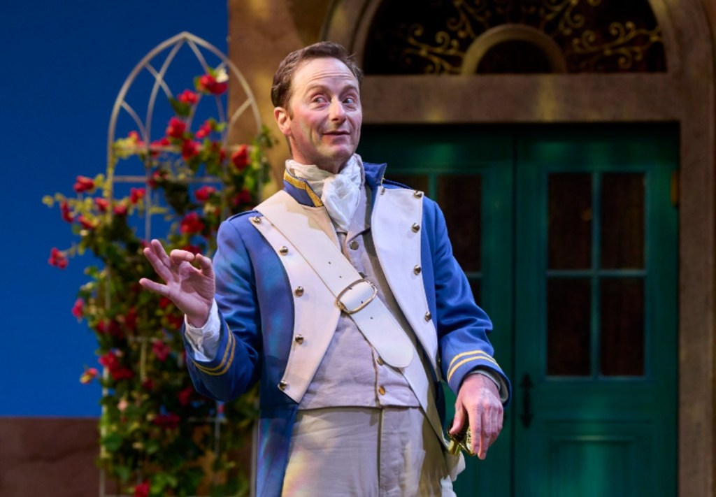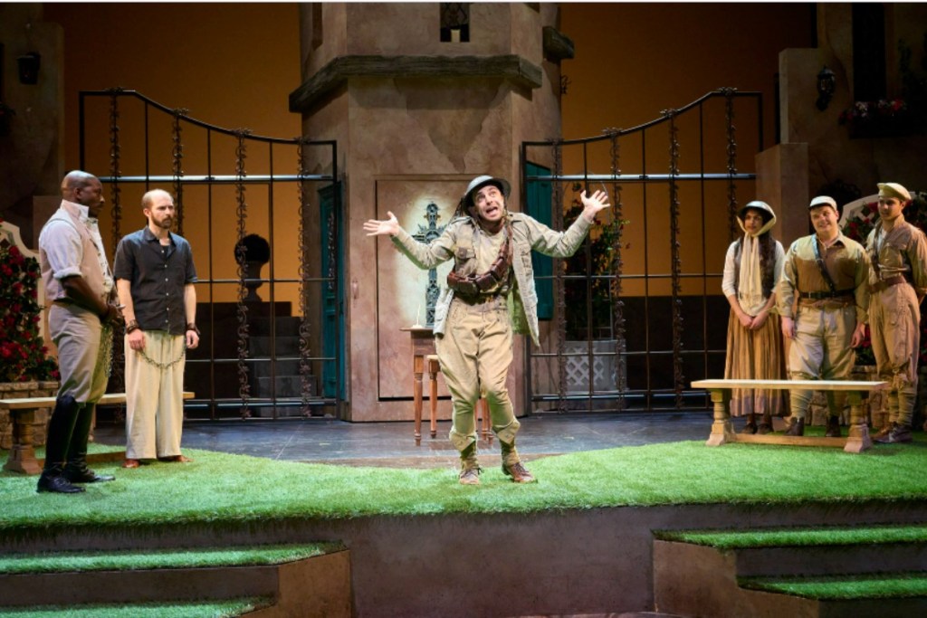 The lighting by Rick Martin picks up on the idea of sunny Sicily and the multi-level, three dimensional set by Jeff Herrmann provides what look like stucco covered stone structures and an abundance of lush bougainvillea on trellises. The set’s central tower can be quickly rotated to show 4 different sides appropriate to different scenes and the trellises provide handy hiding places so that the characters can eavesdrop on one another.